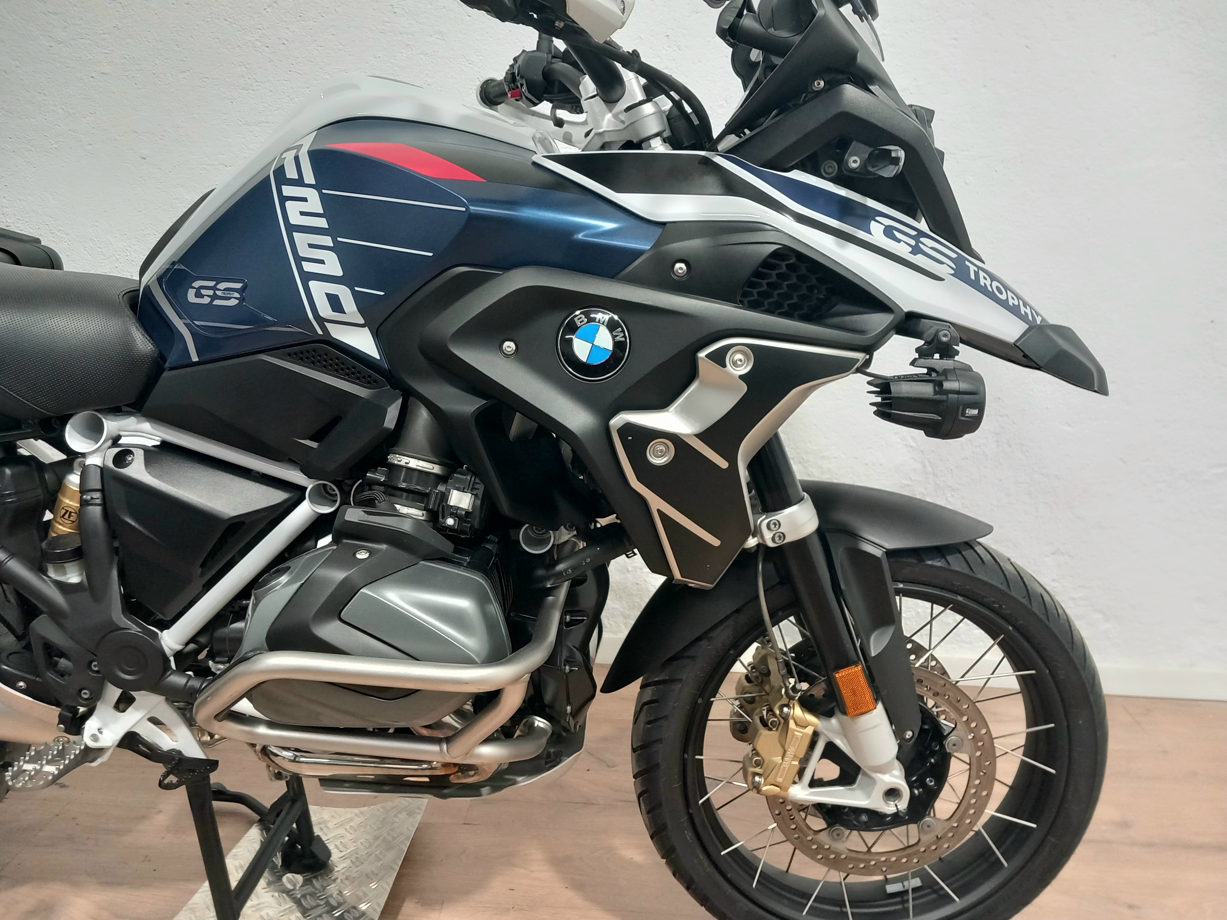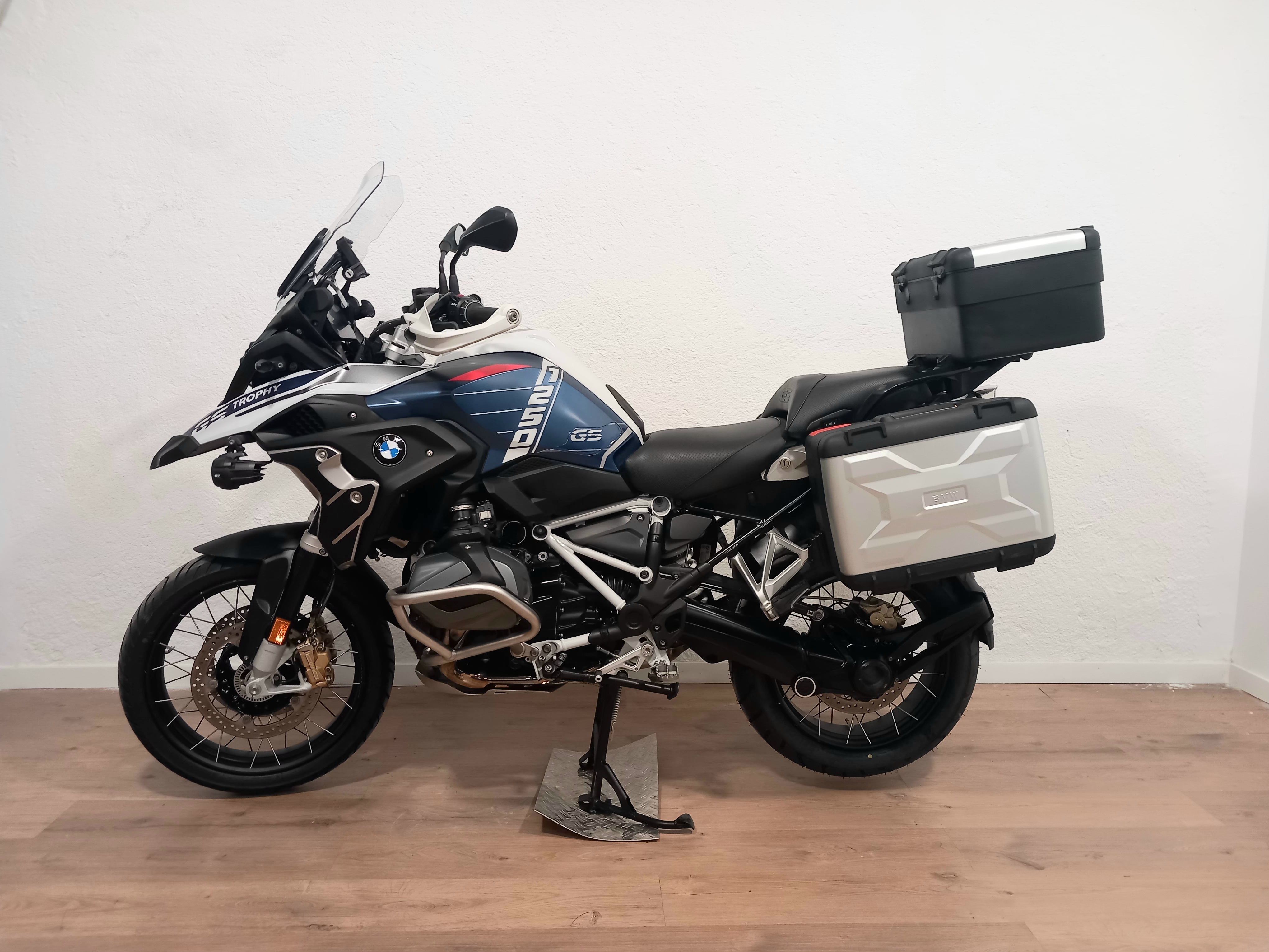 BMW R 1250 GS Trophy inmaculada, re-estreno. Procedente de BMW, con todo el historial pasado, sellado y recién hecha en servicio oficial BMW. Garantía oficial de fábrica y recién revisada en BMW. Neumático trasero a estrenar. Full equipe con los 4 paquetes de su año y en consecuencia absolutamente todos los extras: Paquete iluminación con LED adaptativo e intermitentes multi-función, llantas multi-radio, defensas de motor, escape cromado, botón SOS tele-services, puños calefactables, asientos calefactados independientes, suspensión ESA, arranque sin llave comfort, RDC sensores de presión de neumáticos, pantalla TFT, cambio quick shifter pro, ABS pro, modos de conducción PRO, control de crucero, pre-instalación de navegador, asistente de arranque en pendiente, basculante en negro, DTC, LED, luces antiniebla BMW homologadas y además, lleva las 3 maletas originales BMW Vario. El precio incluye documentación a nombre del comprador y garantía. ¡Pida cita previa para verificar su estado!